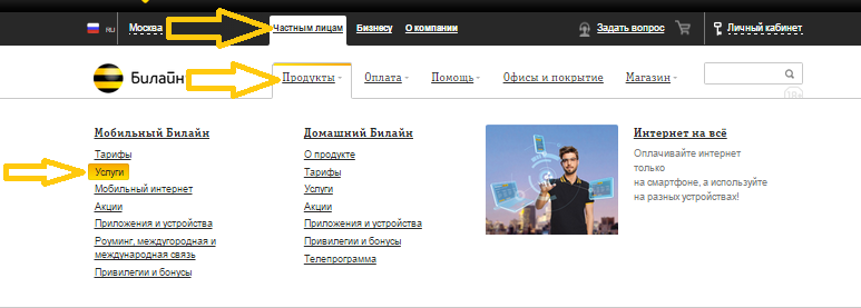 Если вы хотите получить деньги в долг на билайне при помощи кода из SMS, зайдите на сайт оператора, выберите пункт основного меню «Частным лицам», перейдите в подпункт «Мобильный Билайн». В выпадающем списке найдите «Услуги».