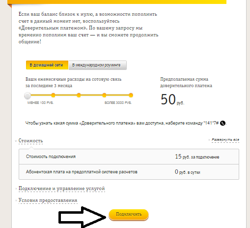 Чтобы узнать, какая сумма вам доступна, наберите *141*7# и нажмите кнопку вызова. Минимальная доступная сумма — 50 рублей, максимальная — 450. Величина доверительного платежа зависит от ежемесячных трат на связь (если вы тратите в месяц меньше 50 рублей, услугу могут вообще не подключить).