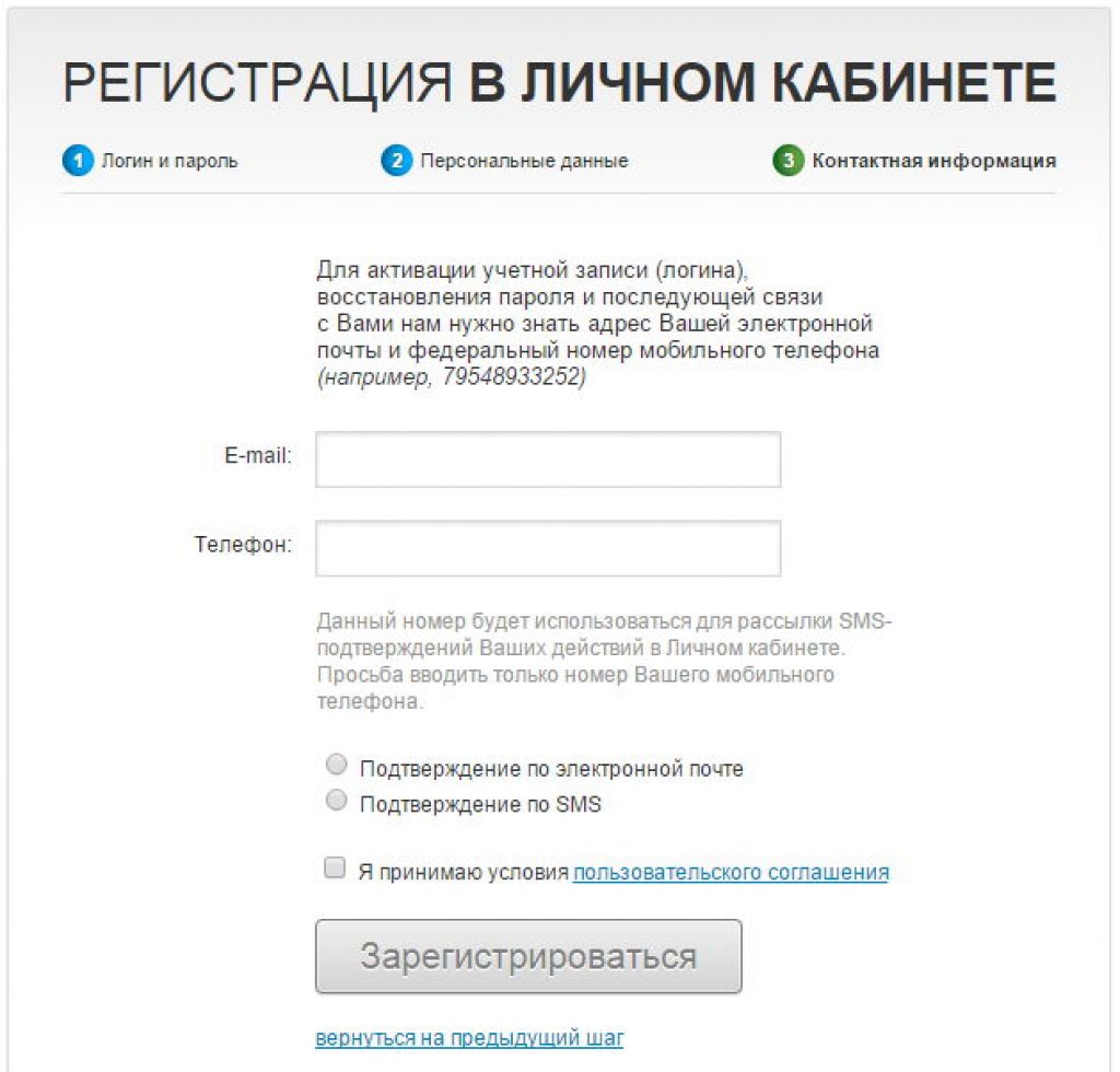 - Чтобы зарегистрироваться в личном кабинете Ростелекома, нужно заполнить и третье окно, в котором физическое лицо указывает свои контактные данные лица, а также активирует аккаунт через его привязку к номеру сотового. Здесь указывается только два параметра, необходимые для того, чтобы после регистрации в личном кабинете Ростелекома можно было восстановить пароль, если вдруг он вылетит из памяти и подтвердить свою волю относительно перечисления денежных средств на тот или иной счет.