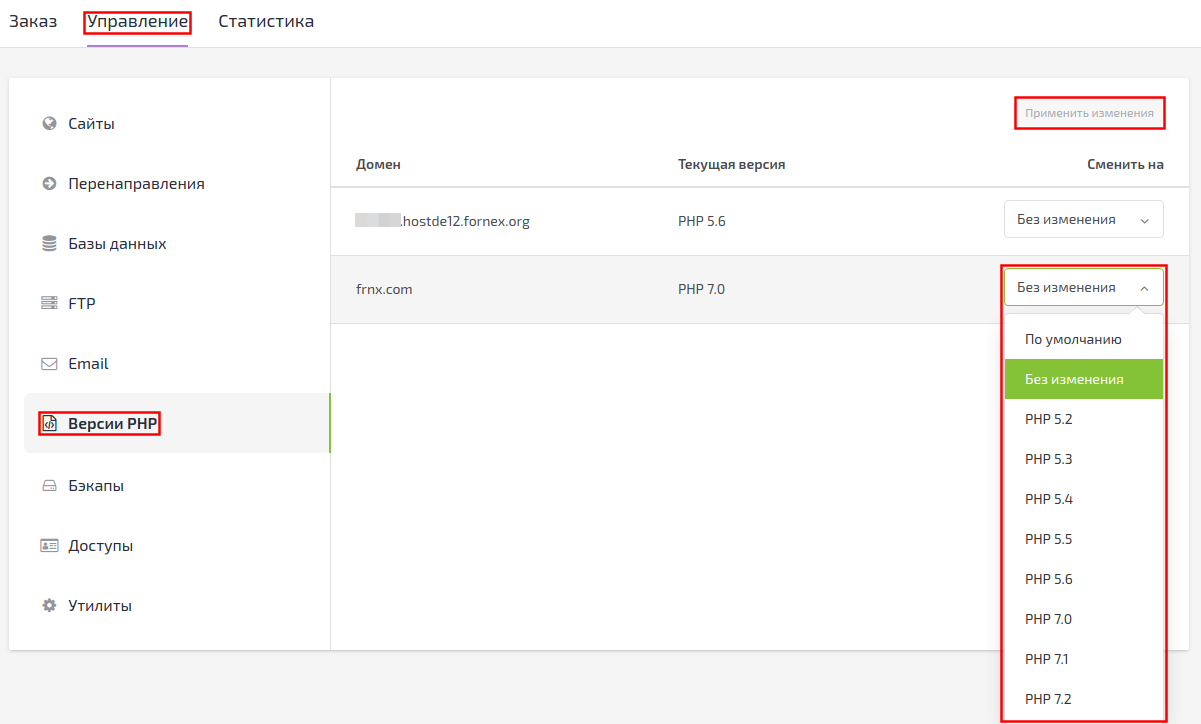 - В этом меню вы можете указывать версию PHP для домена. По умолчанию на хостинге указана версия PHP 5.6