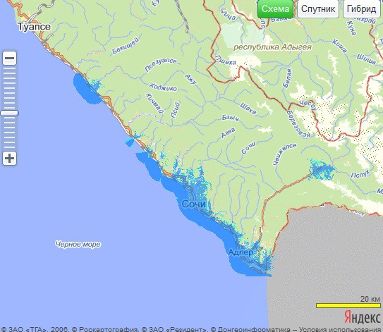 Оригинальное решение предложено отделением в Сочи, где вышки Yota на карте обозначены разноцветными метками: